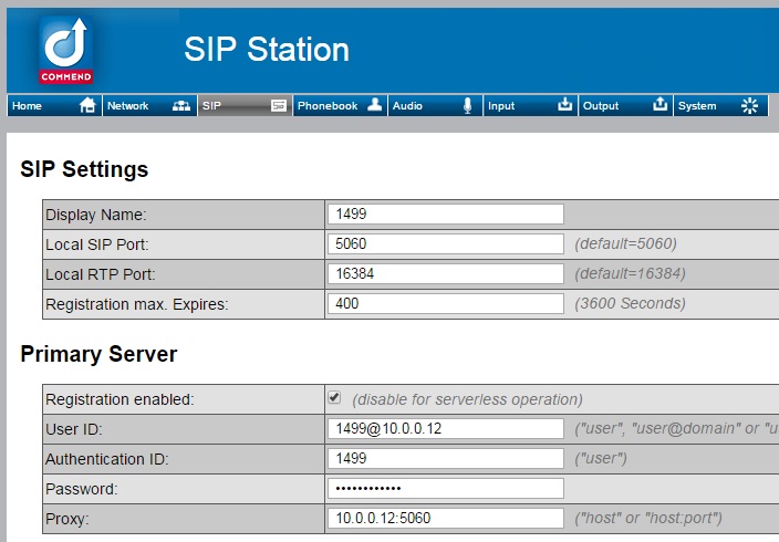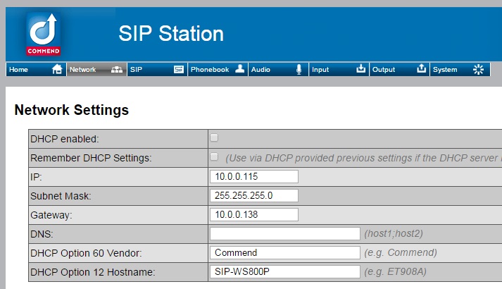 CommendSIP-WS800PSIP-WS201VCAFabrika değerlerinde DHCP aktif olarak başlar ve DHCP server dan ip adresi alır. Web arayüzü ile bağlantı sağlandığında istenirse Network menüsünden DHCP enabled onay kutusunun işareti kaldırılarak statik ip adresi tahsis edilebilir. ![]() SIP menüsünden santralda tanımlanan sip kullanıcısının bilgileri girilerek kayıt (register) olması sağlanır. Registration Max. Expires süresi 400 olarak ayarlanmalıdır. ![]() Phonebook menüsünden tuşa basıldığında aranacak dahili numara girilebilir. |