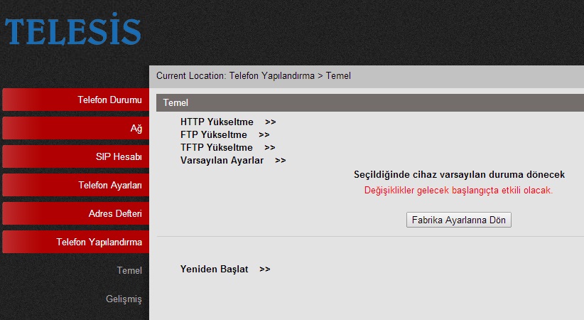 ES270FabrikaAyarlariIleBaslatmaSeti fabrika ayarlarina almak için Menu tuşuna basın, 3. Sistem ayarları altında bulunan 2. Gelişmiş ayarları seçin, şifre tanımlanmış ise şifreyi girin (fabrika ayarlarında şifre yoktur), 6. Varsayılan ayarları yükle seçeneğini seçin. Web arayüzü ile fabrika ayarlarıyla başlatmak için; Telefon Yapılandırma / Temel altında Varsayılan ayarları'i seçin, ![]() Açılan pencerede Fabrika Ayarlarına Dön butonuna basın ![]() |