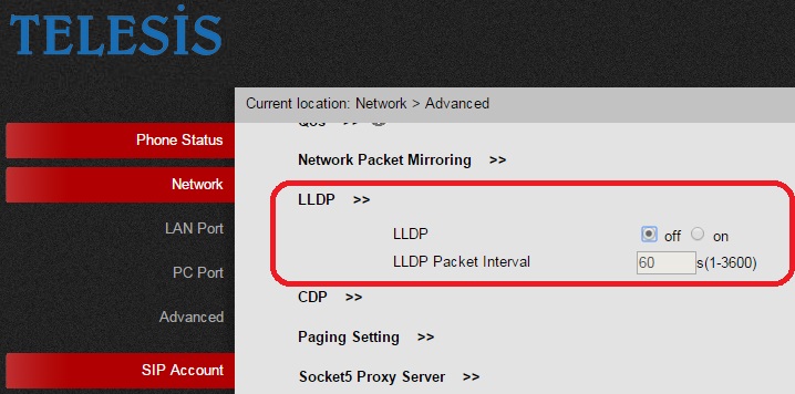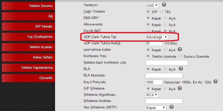 ES270SantralaKayitEtmeES270 ip set auto provision özelliği sayesinde santrala otomatik olarak kayıt edilebilir. Bunun için sip portunun ortak özellikler sayfasında Auto provisioning MAC adr alanına ES270 ip setin mac adresini yazın, set başladığında otomatik olarak kayıt bilgilerini santraldan alıp kayıt olacaktır. ![]() Eğer manuel olarak seti kayıt etmek istiyorsanız aşağıdaki adımları takip edin. ES270 set fabrika ayarlarında DHCP etkin olarak başlar, set açılışta DHCP server dan ip adresi almışsa, santrala kayıt olmak için santralda tanımlı sip portunun hesab adını gireceğiniz Input account ekrana gelir herhangi bir giriş yapılmaz ise set ekranı tarih ve saat ekranına geçer. Sip kullanıcısının hesab adı, auth id ve şifre bilgilerini set üzerinden girebilir ya da sete web arayüzü ile bağlanıp web arayüzü üzerinden de giriş yapabilirsiniz. Setin otomatik aldığı ip adresini görmek için Menu tuşuna basın ve 1. View Status seçerek Enter tuşuna basın. Ekranda gördüğünüz ip adresini web arayüzü adres kısmına yazarak giriş yapabilirsiniz. Set eğer DHCP server dan ip adresi alamamış ise ya da DHCP server yoksa sete ip adresi tanımlama için Menu tuşuna basın Ok tuşları ile 3.System settings'i seçin, 2.Advanced Settings seçin, şifre alanını boş geçip OK tuşuna basın, 2.Network seçin Enter tuşuna basın, 1.Lan Port seçip Enter tuşuna basın, ekrandan Static seçip Enter tuşuna basın, IP alanına sete vereceğiniz ip adresini numerik tuş takımını kullanarak girin, nokta kullanmak için * tuşuna basın, ip adresi girdikten sonra Save butonuna basın, Seti yeniden başlatmak için OK butonuna basın. Türkçe dil seçeneğini seçmek için Menu tuşuna basın Ok tuşları ile 3.System settings'i seçin, 1.Phone Settings'i seçip Enter tuşuna basın, 1.Language seçin ve Enter tuşuna basın, Turkish seçin ve Save butonuna basın. Setin dili Türkçe olacaktır. Setin ip adresini ayarladıktan sonra web arayüzünün adres kısmına setin ip adresini yazın, fabrika değerlerinde kullanıcı adı ve şifre root dur. Kullanıcı adı ve şifreyi yazdıktan sonra Ok butonuna veya Giriş yap butonuna basın. Web arayüzü menülerini Türkçe yapmak için sağ tarafta liste kutusundan Turkish seçin. ![]() Seti santrala register etmek için Sol tarafta SIP Hesabı'nı tıklayın. Sağ tarafta Hesap liste kutusundan Hesap 1'i seçin. ![]() Açılan Hesap1/Temel sayfasında Etkin onay kutusunu işaretleyin, Hesabın kullandığı hat sayısını 1, Ekran Adı metin kutusuna set ekranında çıkmasını istediğiniz karakterleri girin, Kullanıcı adı metin kutusuna santralda tanımlı sip portunun Hesap adını girin, Yetki Adı metin kutusuna santralda tanımlı sip portunun Authentication id.'sini girin, Şifre metin kutusuna santralda tanımlı sip portunun Şifre metin kutusunda yazan karakterleri girin. Son olarak SIP Sunucu metin kutusuna santralın ip adresini ya da URL adresini girin. Set ekranında arayan numara bilgisi ve varsa arayan abonenin hesap adını görnek için Telefon ayarları / Özellikler'i tıklayın ![]() Caller id kaynağı liste kutusundan FROM'u seçin Kodek ayarları için Telefon Ayarları/Gelişmiş'i tıklayın ![]() Açılan sayfada Ses kodeklerinde G711A ve G711U kodeklerini seçin ve Payload değerini 30ms yapın ES290 setler LAN içinde yer alıyorsa SIP hesabı tıklandığında açılan sayfa da Gelişmiş'i tıklayın ![]() Açılan sayfada UDP Canlı tutma tipi liste kutusundan Etkin değil'i seçin ![]() Network / Advanced sayfasında LLDP özelliğini Kapalı seçin. ![]() Son olarak santrala web arayüzü ile bağlanıp Ethernet/Medya tıklandığında açılan Temel voip medya ayarları sayfasında G711 gönderme ve alma paket boyutunu 30 ms olarak yapın. ![]() |