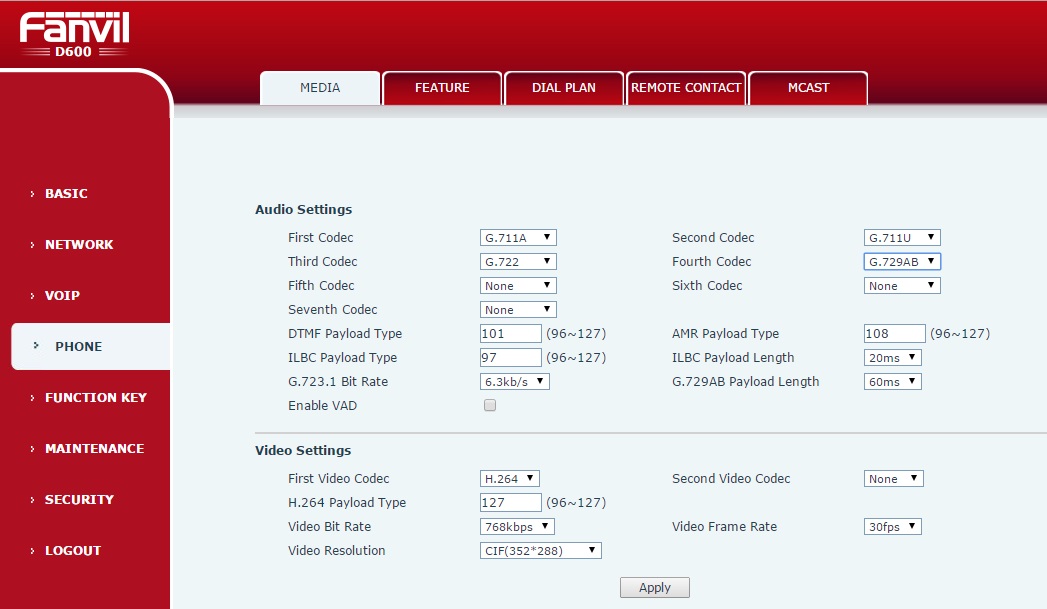 FanvilD600D900Fabrika ayarlarında DHCP aktif olduğu için setin ip adres alabileceği bir DHCP server'a bağlanması gerekir. Setin DHCP'den aldığı ip adresini Menu veya Sysinfo tuşuna basıp 1.Status seçilmeli ve 2.WAN IP seçeneğinden ip adresi görülür. Web tarayıcının adres kısmına setin ip adresini yazın, fabrika ayarlarında kullanıcı adı ve şifre "admin" dir. Sol tarafta yer alan Network / Wan sayfasında sete statik ip adresi verebilirsiniz. Ip adresi değiştirdikten sonra Apply butonuna basıp seti yeniden başlatın. ![]() oip / Sip sayfasında Server address alanına santralın ip adresini, authentication user, password ve sip user alanlarına santralda tanımladığınız sip kullanıcının parametrelerini girin. ![]() Aynı sayfada yer alan codec settings sayfasında enable codecs alanına resimdeki gibi kodekleri sıralayın. ![]() Sette BLF (Busy Lamp Field) özelliğini kullanarak santralın portlarının meşguliyetini izlemek için; Sol tarafta yer alan Function Key penceresinde Function Key settings altında Value sutununa erişim kodlarını yazın Type ve subtype sutunlarında aşağıda resimde görülen ayarları girin. ![]() |