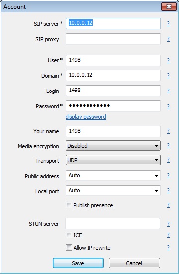 MicroSIPSoftphoneSantrala SIP kullanıcı-abone ekleme? linkinde açıklandığı şekilde sip kullanıcısı ekledikten sonra MicroSIP softphone'a santral sip kullanıcısında kullandığınız hesap adı ve şifreyi girmek için MicroSIP ana penceresinde sağ mouse'u tıklayın. ![]() Açılan pencerede Accounts'u seçerek girin gerekli alanları doldurun ![]() Ana pencerede sağ mouse'u tıklayın ve Settings'i seçin ve Video codec olarak H264'u seçin, Camera liste kutusundan santrala bağlı kamera'yı seçin ![]() Arama yapmak için ana pencerede adres kısmına dahili numarayı yazın ve Call butonuna basın eğer video araması yapılacaksa video call seçip butona basın ![]() |