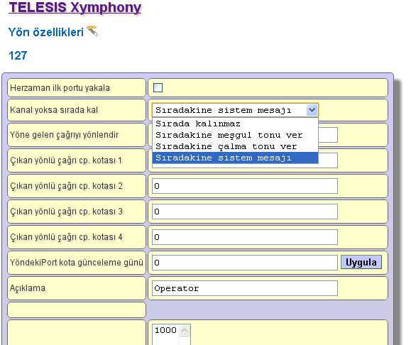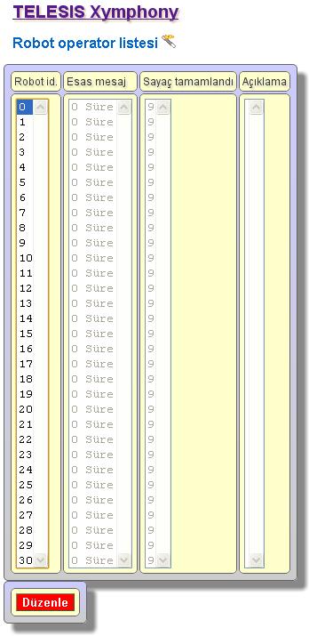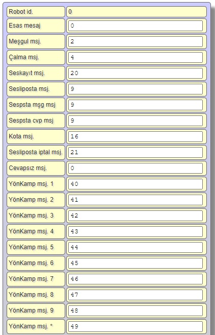 OperatorSirasindaBekleyenCagrilaraBekleyenCagriMesajlariOkutmaYön kullanan (örneğin operatör telefonları) abonelerden bir tanesinin Ortak özellikler sayfasında Yönde kullanılır metin kutusunun yanında yer alan Düzenle butonuna basılarak Yön özellikleri sayfasına gidilir. ![]() Kanal yoksa sırada kal liste kutusundan sıradakine sistem mesajı seçilir. ![]() Dış hattın Hesap özellikleri sayfasında acil hat alanına 840+Robot operatör tablo numarasını yazın, aşağıdaki resimde dış hattan gelen çağrıyı Robot operatör tablo 00'ın karşılacağı görülmektedir. ![]() Ana sayfada Yol atama/Robot operatör tıklanarak açılan Robot opetaör listesi tablosunda robot id 0 seçilip düzenle tıklanır. ![]() Robot operatör özellikleri tablosunda YönKamp msj.1 metin kutusu sırada bekleyen ilk çağrıya, YonKamp msj.2 ikinci çağrıya benzer şekilde yonKamp.* metinkutusu onuncu ve daha yüksek sıradaki sırada bekleyen çağrılara okutulacak mesajı gösterir, örneğin sıradaki ilk çağrıya 40 numaralı sistem mesajını, ikinci sıradaki çağrıya 41 numaralı sistem mesajını vb sırada mesajları okutmak için tabloya aşağıdaki resimde görüldüğü gibi mesajları girmek gerekir. ![]() |