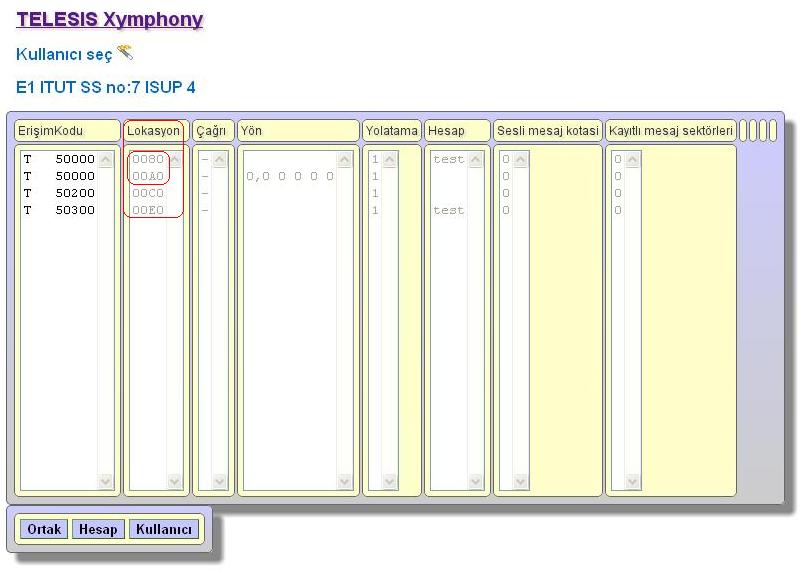 Statu-BilgiÇalışma bilgileri sayfasında Xymphony işletim sisteminin genel çalışması ile ilgili bilgiler bulunur. Özel durumlarda görüntülenen alanlar aşağıdadır: ÇağrıKayıt sayısı Bu kayıtları indirmek için, Ethernet/Çağrı Kayıt/CMDR Protokolü değerini XTools yapın ve Ethernet/Çağrı Kayıt/Çağrı Kayıt İstemcisi IP adresi değerini XTools programını çalıştırdığınız PC'nin IP adresi olarak düzenleyin. Eğer CMDR kayıtlarını hiçbirzaman bilgisayarınıza indirmeyecekseniz, Sistem/Temel/Raporlanmayacak Kayıtlar seçeneğindeki tüm kutuları işaretleyin, böylece bu kayıtlar oluşturulmaz. KONFİGÜRASYON HATALARI: Erişim Kodu Kural Hatası!: Eğer Sistem/Temel/Raporlanmayacak kayıtlar 'B' kutusu işaretsiz ise bütün çakışmalar için kayıt üretilir. Hesap id. kural hatası!: Yetersiz VOIP kanal lisansı!: Yetersiz DVR kanal lisansı!: No7 cic. prefix conflict!: V5.2 faults!: INFO: Belirtilen bilgi kodları yalnızca fabrika testleri içindir. ![]() Yukarıdaki pencerede; Sistemin iki adet Ethernet konnektörü olduğu görülmekte, sadece 10.1.0.12 ip adresli ethernet konnektörünün şebekeye bağlandığı diğerinin ise bağlanmadığı görülmektedir. Stillink 3200 ya da X1 r5 santrallarda voip kanalı sayısı yüksek olduğu için bir den fazla ethernet konnektörü kullanılmakta ve sistem voip görüşmelerde ve otomatik ses kayıt işlemlerinde her 2 ethernet konnektörünü kullanmaktadır. Bu sebeple eğer sistemde voip yada otomatik ses kayıt uygulaması yapılacak ise her 2 ethernet konnektörünün şebekeye bağlanması gereklidir. Ayrıca Sistemde lisans yüklü olmadığı ve 22 saat sonra sistemin abone, dış hat ve E1 arayüzlerinin çalışmayacağı anlaşılmaktadır. Erişim kodu kural hatası alanında 50000 erişim kodlu iki adet port olduğu ve bunların fiziksel adreslerinin 00A0 ve 0080 olduğu anlaşılmaktadır. Portların fiziksel adresleri Kullanıcılar penceresinde Lokasyon alanında görülebilir Hesap id kural hatası alanında 50000 ve 50300 erişim kodlu portlarda aynı hesap id sinin kullanıldığı görülmektedir. ![]() |