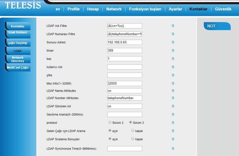 UC902LDAPTelesis santrallarında LDAP server özelliği vardır. IP Sete bir çağrı geldiğinde ya da ip setten arama yapıldığında eğer arayan ya da aranan numara santral rehberinde kayıtlı numara ile çakışıyorsa set numara bilgisinin yanına santral dan aldığı isim bilgisini de lcd ekranda gösterebilmektedir. Sete Web arayüzü ile bağlandığınızda Kontaklar/LDAP sayfasında aşağıda gösterilen ayarlar yapılmalıdır; LDAP Adı Filtre metin kutusuna : (&(cn=%s)) LDAP Numara Filtre: (&(telephoneNumber=%s)) Sunucu adresi : Santralın ip adresi Liman (Port) : 389 (Santralın temel ethernet ayarları sayfasında LDAP sinyalleşme portu, fabrika ayarlarında 389 dur) Baz: herhangi bir harf ya da rakam LDAP Name Attributes: cn LDAP Number Attributes: telephoneNumber LDAP Görünen ad: cn Protokol: Sürüm 3 Gelen Çağrı için LDAP Arama : Açık LDAP Sıralama Sonuçları : Açık ![]() |