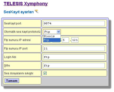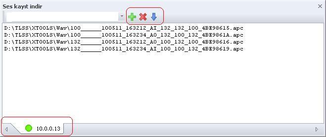 XtoolsSesKayitIndirSantraldan otomatik ses kayıtlarını Xtools aracılığı ile indirmek için santralın ana sayfasında Ethernet/Ses kayıt tıklandığında açılan Ses kayıt ayarları sayfasında Otomatik ses kayıt protokolu Xtools seçilmeli ve Xtools Ses kayıt istemcisi Ip adresi metin kutusuna Xtools'un koşturulduğu pc'nin ip adresinin yazılıp ardından santral parametrelerinin saklanıp santralın yeniden başlatılması gerekir. ![]() Ses kayıt indir butonunun üzerine gelindiğinde otomatik gizli pencere açılır. Ses kayıtlarını indirmek için metin kutusuna santralın ip adresi Ya da url adresini ve port numarasını yazın. Santral ses kayıt için standart port numarasını (9874) kullanıyorsa port numarasını yazmadan da bağlantı sağlayabilirsiniz. Bağlantı sağlandığında alttaki ikon yeşil rengi alır, bağlantı sağlanamaz ise kırmızı rengi alır. Bağlantıyı koparmak için Bağlantıyı çöz butonunu tıklayın, ekrandaki bilgilerin kaymasını durdurmak için Kaydır butonunu tıklayın. ![]() Aynı anda dört farklı santraldan ses kayıt indirilebilir bunun için bir yerden ses kayıt indiriliyor iken metin kutusuna ikinci santralın ip adresi veya url adresini yazıp bağlan butonuna basın. İlgili Dökümanlar Otomatik ses kayıtları Xtools dışında FTP protokolu aracılığı ile bir ftp server'a gönderebilir. Otomatik ses kayıtlarının ftp sunucuya gönderimi |